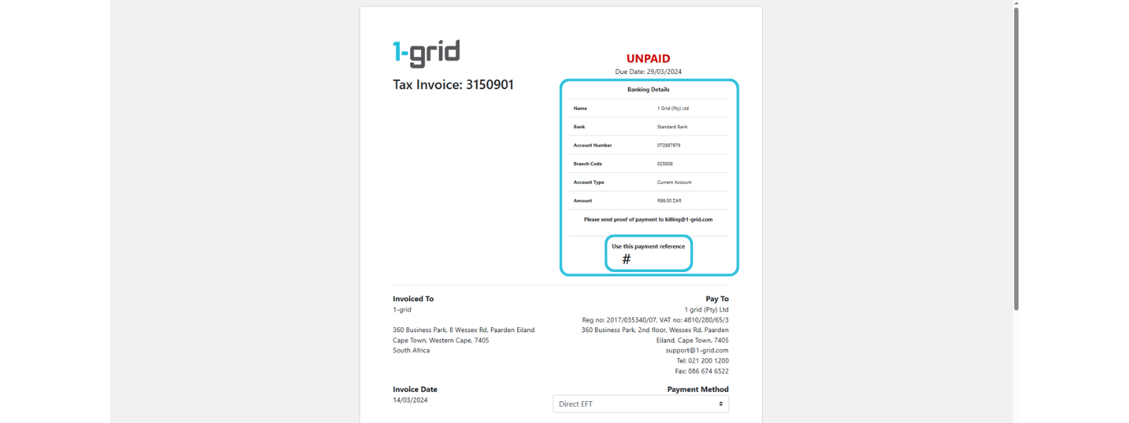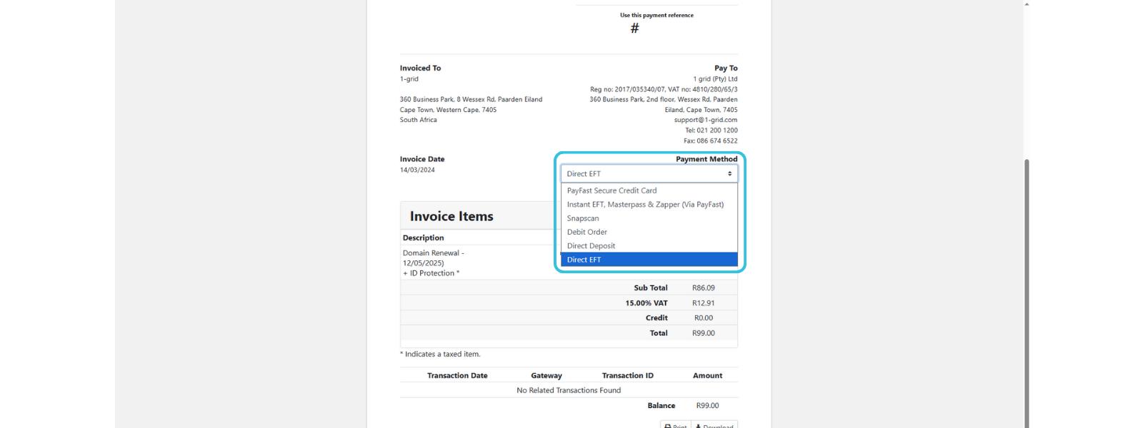 At 1-grid, we understand how important it is to keep your hosting, email, and domain services running smoothly without any interruptions. That’s why we offer the option for paying your invoices via Direct EFT (Electronic Funds Transfer) as a trusted and familiar way to pay securely through your own bank account.